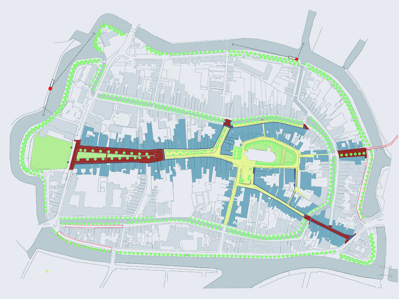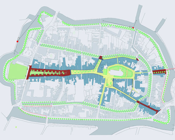 In de binnenstad van Franeker is de oorspronkelijke terp nog herkenbaar. De sluimerend aanwezige hoogteverschillen zijn gebruikt als inrichtingsmiddel om het specifieke karakter van de terp te versterken.